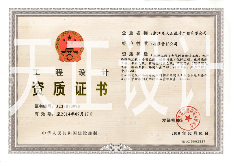 经省建设厅、国家建设部审查核准,我司顺利通过工程勘察设计资质换证,保留了原有甲、乙级工程设计资质中的业务范围。新的工程设计资质范围为:化工石化医药行业甲级、轻纺行业(食品发酵烟草工程)专业甲级、建筑行业(建筑工程)甲级;环境工程(大气污染防治工程、水污染防治工程)专项乙级、轻纺行业(化纤工程、化纤原料工程)专项乙级、商物粮行业乙级、市政行业(城镇燃气工程、给水工程、环境卫生工程、排水工程、热力工程)专项乙级。可从事资质证书许可范围内相应的建设工程总承包业务以及项目管理和相关的技术与管理服务。